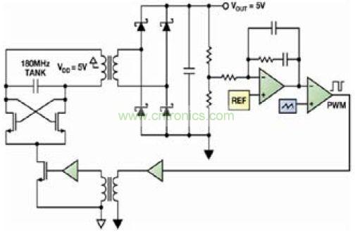 微變壓器可以用于提供集成的信號(hào)和電源隔離,最大額定值為5 kV rms [1]。對(duì)于信號(hào)傳輸,輸入數(shù)據(jù)通常在編碼之后再傳輸給數(shù)據(jù)變壓器原邊。副邊則通過(guò)解碼來(lái)還原信號(hào)。輸入與輸出之間的隔離通過(guò)初級(jí)線圈與次級(jí)線圈之間的絕緣層來(lái)實(shí)現(xiàn)。為了在隔離之間實(shí)現(xiàn)高效的電源傳輸,用一個(gè)自振高頻振蕩器來(lái)驅(qū)動(dòng)電源變壓器的原邊,同時(shí)用高頻肖特基二極管來(lái)提供整流直流電壓。調(diào)節(jié)由次級(jí)控制器產(chǎn)生的PWM完成,該P(yáng)WM通過(guò)一個(gè)反饋?zhàn)儔浩饕赃h(yuǎn)低于振蕩頻率的頻率來(lái)開(kāi)啟和關(guān)閉振蕩器,如圖2(a)所示。通過(guò)反饋?zhàn)儔浩鞯姆答佇盘?hào)的工作方式與通過(guò)數(shù)據(jù)變壓器