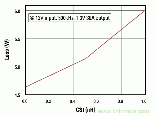 圖1為具備雜散電感和電阻(由封裝鍵合線、引線框以及電路板布局和互連線帶來)等寄生效應(yīng)的半橋電路。共源電感(CSI)傾向于降低控制FET(高邊FET)的導(dǎo)通和關(guān)斷速度。如果與柵極驅(qū)動串聯(lián),通過CSI的電壓加至柵極驅(qū)動上,可使FET處于導(dǎo)通狀態(tài)(條件:V = -Ldi/dt),從而延遲晶體管的關(guān)斷。這也會增大控制FET的功耗,如圖2所示。