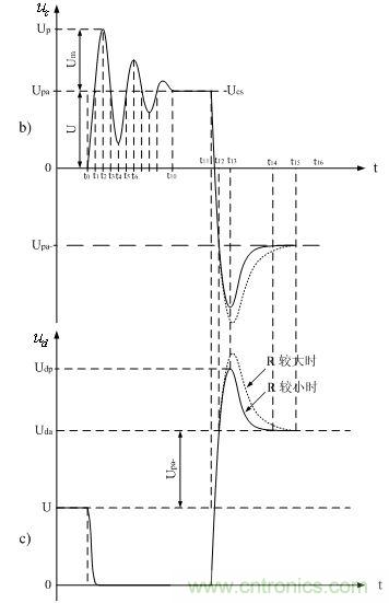 到t10時刻,分布電感Ls與分布電容Cs產(chǎn)生的阻尼自由振蕩的幅度被衰減到差不多等于0,此時,分布電容Cs兩端的電壓等于變壓器初級線圈的正激輸出半波平均值Upa。關(guān)于半波平均值Upa和Upa-的計算方法及定義,請參考第一章的(1-70)和(1-71)式及說明。