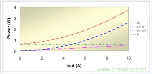 如果意識到電源損耗與輸出電流相關(guān)(可用輸出電流替換 X),那么系數(shù)項(xiàng)就能很好地與不同來源的電源功率損耗聯(lián)系起來。例如,ao 代表諸如柵極驅(qū)動(dòng)、偏壓電源和磁芯的固定開銷損耗以及功率晶體管 Coss 充電與放電之類的損耗。這些損耗與輸出電流無關(guān)。第二項(xiàng)相關(guān)聯(lián)的損耗 a1 直接與輸出電流相關(guān),其典型表現(xiàn)為輸出二極管損耗和開關(guān)損耗。在輸出二極管中,大多數(shù)損耗是由于結(jié)電壓引起的,因此損耗會(huì)隨著輸出電流成比例地增加。