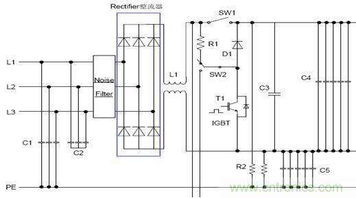電源系統(tǒng)是指將輸入系統(tǒng)的動(dòng)力電源轉(zhuǎn)換成用于驅(qū)動(dòng)交流電機(jī)的直流或交流電源,根據(jù)實(shí)際控制方式的不同,一般可以分為“交直交”電壓源型逆變電路,“交直交”電流源型逆變電路,“交交”型變頻電路以及泵電源電路等。圖1是“交直交”電壓源型電源系統(tǒng)的典型電路,如果將并聯(lián)的濾波電容去掉,在直流側(cè)串聯(lián)一個(gè)大濾波電感則為“交直交”電流源型電路。