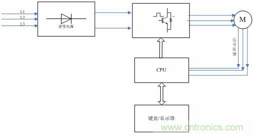 功率開(kāi)關(guān)器件通過(guò)根據(jù)來(lái)自微處理器板的控制信號(hào)控制大功率輸出器件的關(guān)斷和導(dǎo)通,來(lái)實(shí)現(xiàn)對(duì)交流電機(jī)的輸出電流和電壓的控制。根據(jù)控制方式的不同,其輸出方式由方波輸出逐漸發(fā)展到PWM輸出或SPWM輸出。開(kāi)關(guān)器件也由原來(lái)的GTR,MOSFET,發(fā)展到IGBT,IPM等。參見(jiàn)下面的典型IGBT逆變輸出電路。