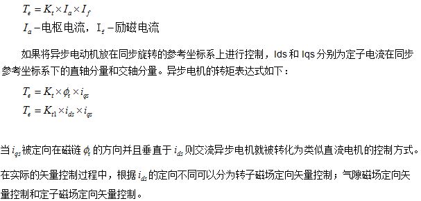 矢量控制是指根據(jù)電機(jī)運(yùn)行狀況同時(shí)控制輸出量的幅值和相位。其基本的工作原理是通過(guò)電機(jī)內(nèi)以同步轉(zhuǎn)速旋轉(zhuǎn)的參考d-q參考坐標(biāo)系的數(shù)學(xué)方法,解藕出控制電機(jī)勵(lì)磁方向的電流分量Id和控制電機(jī)的轉(zhuǎn)矩方向的分量Iq,從而可以將異步電機(jī)的控制方法等效為傳統(tǒng)直流電機(jī)的控制。
