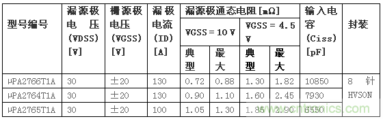 這三種新型MOSFET產(chǎn)品,包括 µPA2766T1A,擁有0.72 m?至1.05 m?(標準值)的通態(tài)電阻額定值。這一范圍可實現(xiàn)更好的產(chǎn)品選擇,從而能夠以最佳的狀態(tài)滿足用戶在運行電流或環(huán)境條件方面的要求。而且,它還使得客戶能夠提供最佳產(chǎn)品,有助于提高功率效率、降低空間要求。