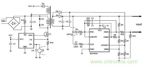 NCP4354是專為與NCP1246配合使用而設(shè)計的一款低待機(jī)能耗次級端恒流恒壓 (CCCV) 控制器,帶有LED驅(qū)動器 (圖3)。其價值在于,可檢測空載條件并使主控制器進(jìn)入超低頻率跳周期模式,以降低待機(jī)功耗;只有一個反饋和關(guān)閉(OFF)控制所需的光耦;提高了空載效率(小于15 mW);元件更少。此外,它還具有CCCV反饋和LED驅(qū)動器、供電電壓高達(dá)36 V、在關(guān)機(jī)模式可調(diào)整最低Vout、1.25 V參考精度為1%,以及Icc大于100 μA等特性。NCP4354與NCP1246一起使用,可調(diào)節(jié)Vmin,市場及應(yīng)用范圍包括筆記本電腦適配器及其他外部電源適配器。NCP435x系列還有一款不帶LED驅(qū)動器的產(chǎn)品NCP4353,可以與NCP1246一起使用來調(diào)節(jié)Vmin(僅B版本)。