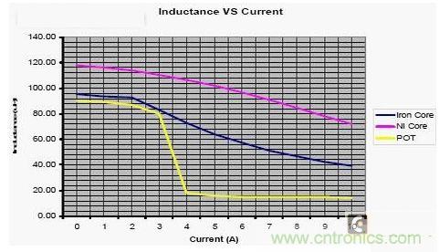 下圖為三種不同的磁芯,其電感量隨電流的變化的曲線。從圖5 中可以看出:在設計汽車音響直流電源濾波器時,要根據(jù)工作電流的范圍來選擇合適的扼流圈。當汽車音響的正常工作電流大于3A 時,若選擇圖中POT 磁芯的扼流圈,電感量急劇降低,根本起不到濾波器的效果。