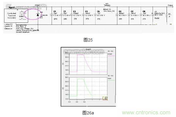 在ISO 7637-2:2004、GMW3100-08.2001:3.2.1.3等標準中規(guī)定了沿電源線的電瞬態(tài)傳導的干擾脈沖的抗擾性失效模式、嚴重程度和測量,提供了5 種典型脈沖波形,雖然沒有涵蓋所有可能出現(xiàn)在車輛上的各種瞬態(tài)脈沖,但適用于各種動力系統(tǒng)的道路車輛,例如:火花點火發(fā)動機、壓燃式發(fā)動機、電動機、混合動力驅動系統(tǒng)。針對這5種典型的瞬態(tài)傳導脈沖,在Saber仿真環(huán)境中進行該電源濾波器電路(圖13)的仿真如下: