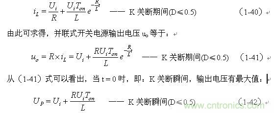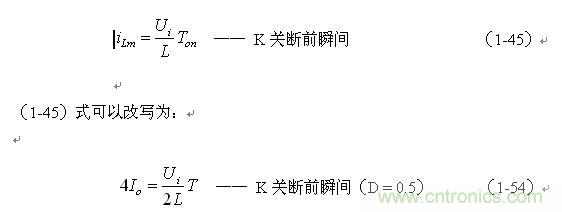(1-44)式中iL為流過儲能電感L的電流(瞬時值),t為時間變量;i(0)為的初始電流,即:控制開關(guān)K接通前的瞬間流過儲能電感L中的電流。當(dāng)開關(guān)電源工作于電流臨界連續(xù)狀態(tài),或不連續(xù)電流狀態(tài)時(即D≤0.5),i(0) = 0 ,由此可以求得流過儲能電感L的最大電流為: