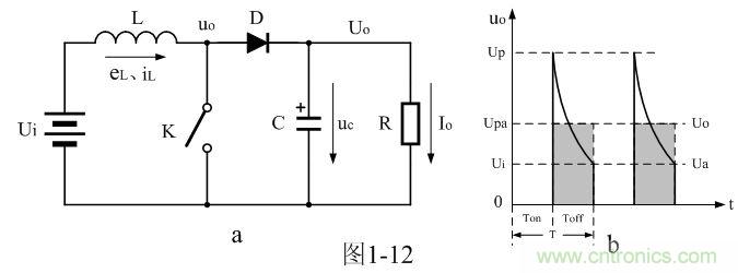 在圖1-12-a中,當(dāng)控制開關(guān)K接通時,輸入電源Ui開始對儲能電感L加電,流過儲能電感L的電流iL開始增加,同時電流在儲能電感L中也要產(chǎn)生反電動勢eL;當(dāng)控制開關(guān)K由接通轉(zhuǎn)為關(guān)斷的時候,在儲能電感L兩端就會產(chǎn)生反電動勢eL。eL反電動勢的方向與開關(guān)K關(guān)斷前的方向相反,但與電流的方向相同,因此,在控制開關(guān)K兩端的輸出電壓uo等于輸入電壓Ui與反電動勢eL之和。