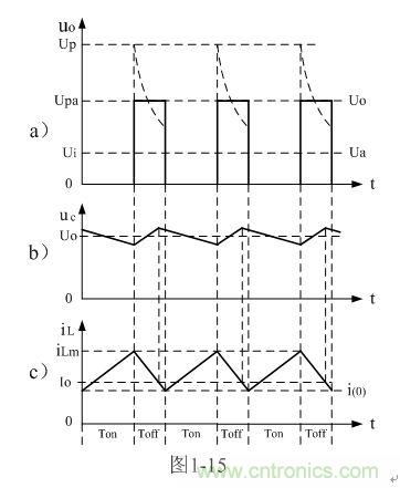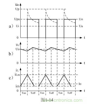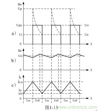 圖1-12-b表示并聯(lián)式開關(guān)電源輸出電壓中各種成份之間的關(guān)系。其中,Ui為輸入電壓、 uo為并聯(lián)開關(guān)K兩端的輸出電壓、Up為輸出電壓uo的峰值,Upa是輸出電壓uo的半波平均值,Ua是輸出電壓uo的平均值,Uo為直流輸出電壓。