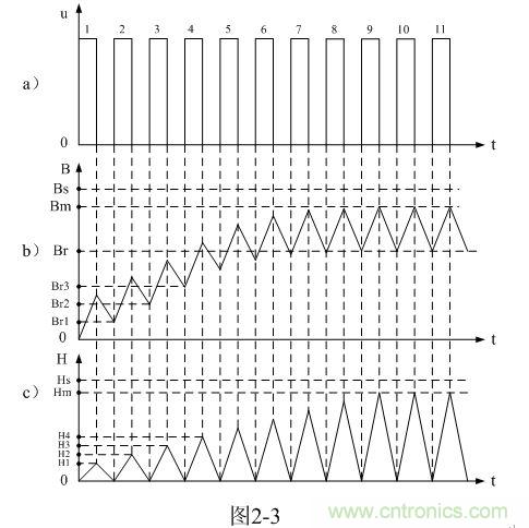 從圖2-3-a)和圖2-3-b)可以看出,每輸入一個直流脈沖電壓,變壓器鐵芯中的磁感應(yīng)強(qiáng)度B或磁通