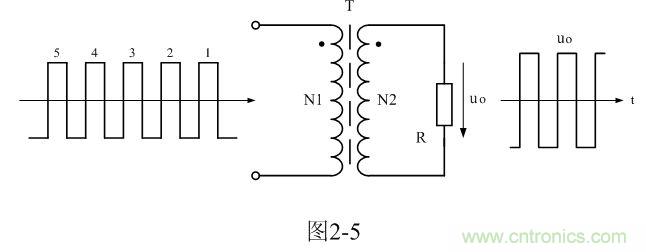 為了簡單起見,我們把雙激式變壓器開關電源等效成如圖2-5所示電路。圖2-5與圖2-1所示電路的不同之處在于,圖2-1輸入電壓是直流脈沖方波,而圖2-5輸入電壓是交流脈沖電壓方波。因此,圖2-5所示電路與一般的變壓器電路在工作原理上沒有根本的區(qū)別。