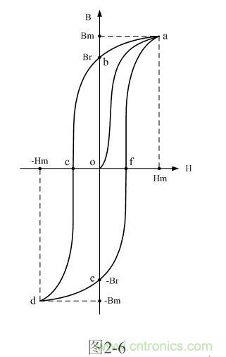從圖2-6還可以看出,雖然磁感應強度被磁場強度磁化的時候可以同時到達正、負最大值,但在磁場強度經過零的時候,磁感應強度與磁場強度總是出現(xiàn)一個相位差。所以,圖2-6中由abcdfa各線段組成的曲線也被稱為磁滯回線,因此,圖2-6也可以稱為雙激式變壓器鐵芯的磁滯回線圖。