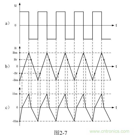 從圖2-7-a)和圖2-7-b)可以看出,每輸入一個交流脈沖電壓,變壓器鐵芯中的磁感應強度B或磁通