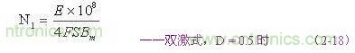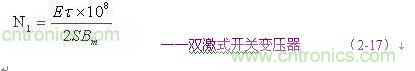 (2-17)和(2-18)式,為計算雙激式開關變壓器初級線圈N1繞組匝數(shù)的公式。式中,N1為變壓器初級線圈N1繞組的最少匝數(shù),S為變壓器鐵芯的導磁面積(單位:平方厘米),Bm為變壓器鐵芯的最大磁感應強度(單位:高斯),τ為脈沖寬度,或電源開關管的導通時間(單位:秒),E為脈沖電壓的幅度,單位為伏,F(xiàn)為開關電源的工作頻率,單位赫芝。