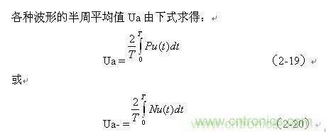 (2-19)、(2-20)式中,Ua和Ua-分別為各種波形的正、負半周平均值,Pu(t)和Nu(t)分別為各種波形的正波形函數(shù)(正半周)和負波形函數(shù)(負半周),T為所選波形的周期。大部分交流電壓波形,其正、負半周平均值的絕對值都相等,但符號相反。