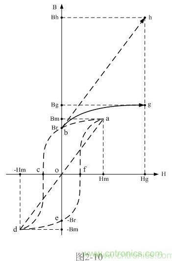 在圖2-10中,虛線表示的磁化曲線a-b-c-d-e-f-a為雙激開關變壓器鐵芯正常工作時的磁滯回線,虛線線段d-a是把開關變壓器鐵芯的磁化曲線理想化后得到的一條曲線(直線),理想磁化曲線是一條斜率等于最大磁感應強度增量與最大磁場強度增量之比,且經過坐標原點的直線;當直線不經過坐標原點時,這條直線可稱為等效磁化曲線(如線段bh)。理想磁化曲線只有一條,但等效磁化曲線卻有無數(shù)多條,且每條效磁化曲線均與理想磁化曲線平行。
