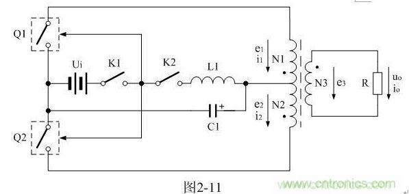 在圖2-11中,開機時,驅動電路電源開關K1首先接通,電源Ui首先給電源開關管Q1、Q2的驅動電路加電;然后開關管電源開關K2接通,由于L1的作用,C1兩端的電壓只能緩慢上升,以保證加到變壓器初級線圈的電壓不會突然升高,使流過變壓器初級線圈的電流過大,導致變壓器鐵芯出現(xiàn)飽和;關機時,開關管電源開關K2首先關斷,而后驅動電路電源開關K1再關斷,由于C1兩端的電壓緩慢下降,使變壓器鐵芯可進行充分退磁,以保證下次開機的時候,變壓器鐵芯磁滯回線的初始相位總是從0開始。