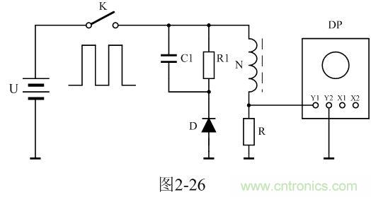 圖2-26中,U是電源電壓,通過控制開關K不斷地接通和關斷,就可以把電源電壓調(diào)制成單極性電壓脈沖;N為變壓器初級線圈,D為反激輸出整流二極管;R1為反激輸出負載電阻;C1為濾波電容;R為取樣電阻,通過測量R兩端的電壓,就可以知道流過變壓器初級線圈的電流;取樣電壓被送到示波器DP進行顯示。