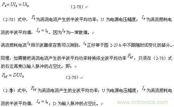 順便指出:(2-79)式的結果,是認為渦流損耗在t1-t2期間(圖2-27-b)完全等于0而求得的,但實際上,在t1-t2期間變壓器初級線圈產(chǎn)生的反電動勢同樣也會在變壓器鐵芯中感應產(chǎn)生渦流損耗電流,即當輸入電壓為0時刻,在變壓器鐵芯中還存在很短暫時間的渦流損耗;由于這種渦流損耗是由反電動勢提供能量來維持的,它將隨著反電動勢能量的衰減很快就衰減到0。