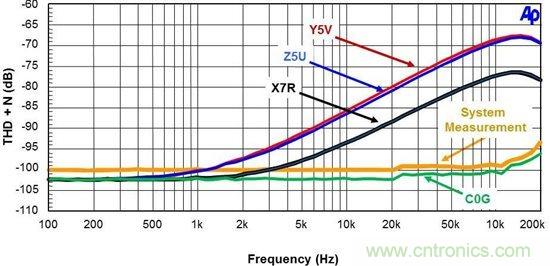 圖 3. 電容器 THD+N 與頻率的關(guān)系