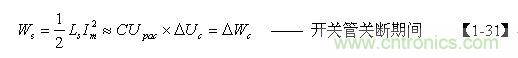 如果不考慮電阻R對(duì)電容器C充電時(shí)產(chǎn)生的分流作用,以及開(kāi)關(guān)管由導(dǎo)通到完全關(guān)斷期間漏極電流(逐步減?。?duì)電容器C充電時(shí)產(chǎn)生的分流作用,即:Wr=0 、Wds=0 ,則【1-28】式可以改寫(xiě)為: