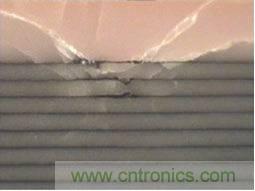 如圖3所示,斷裂通常沿著一層或兩層介質層貫穿整個電容的中部。大多數(shù)的解決方案是將多個電容器通過添加引腳進行疊加,從而在給定尺寸下提高容值,但這需 要消耗大量人力,花費較多成本,并會產生可靠性問題。另外的解決方案使用特殊電介質配方,但同時以犧牲介電常數(shù)作為代價,并影響最終可獲得的容值大小。