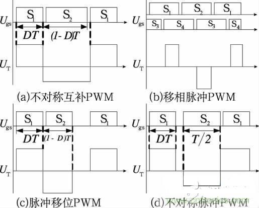 控制型軟開關(guān)半橋DC/DC變換器不增加主電路元器件(可增加電感電容元件以實(shí)現(xiàn)軟開關(guān)條件),通過合理設(shè)計(jì)控制電路來實(shí)現(xiàn)軟開關(guān)。圖1給出4種控制型軟開關(guān)半橋DC/DC變換器的PWM控制策略。