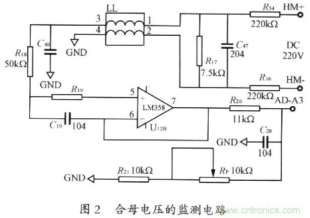 合母電壓監(jiān)測(cè)電路如圖2所示。合母電壓流過(guò)電阻R16、R17、R54,在電阻R17上取樣,故而電阻R17應(yīng)選用高精度電阻。R16和R54因?yàn)橐入娮鑂17大得多,又是出現(xiàn)在分母上,故而不必選用高精度電阻。LL的作用是抑制共模干擾??梢酝ㄟ^(guò)調(diào)節(jié)電位器Rp的大小來(lái)使所要監(jiān)測(cè)電壓的大小符合A/D轉(zhuǎn)換器輸入電壓要求。