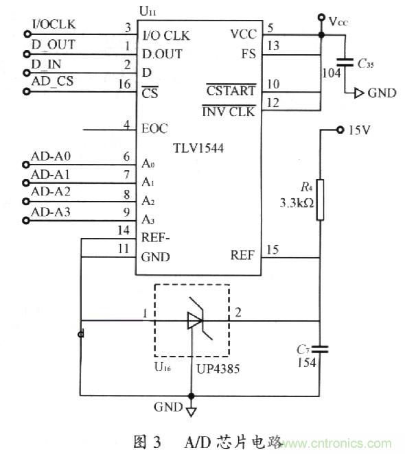A/D轉(zhuǎn)換芯片采用TLV1544。TLVl544的主要特點(diǎn)是:寬范圍的單電源供電,VCC可為2.7~5.5V;芯片內(nèi)部有著較高的轉(zhuǎn)換速率,轉(zhuǎn)換時(shí)間小于10μs;芯片提供4路外部輸入通道,通過(guò)編程給芯片不同的狀態(tài)字設(shè)置可以任意選擇4個(gè)輸入通道之一;芯片有4個(gè)端口作為同步串行接口,通過(guò)SPI總線的形式與微處理器連接;11位A/D轉(zhuǎn)換,足以滿足系統(tǒng)的要求。如圖3所示。