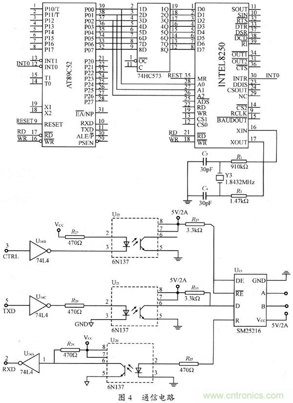 整個(gè)系統(tǒng)內(nèi)部通過(guò)RS485進(jìn)行通信。具體電路如圖4所示。因?yàn)榭刂菩酒疾捎肁T89C52,作為主監(jiān)控單元CPU只有一個(gè)串口,而其并口也沒(méi)有充分利用起來(lái),故通過(guò)可編程串行接口芯片8250擴(kuò)展串口,用并口來(lái)模擬串口。