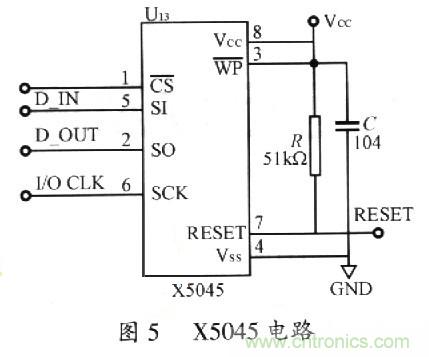 X5045電路的設(shè)計(jì)如圖5所示。本器件將四種功能合于一體:上電復(fù)位控制、看門(mén)狗定時(shí)器、降壓管理以及具有塊保護(hù)功能的串行EEPROM。它有助于簡(jiǎn)化應(yīng)用系統(tǒng)的設(shè)計(jì),減少印制板的占用面積,提高可靠性。將其與CPC以SPI總線方式連接,讀寫(xiě)簡(jiǎn)單,其內(nèi)部的EEPROM還可以保護(hù)一些重要數(shù)據(jù)。