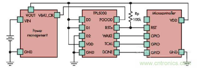 新式解決方案采用針對(duì)長(zhǎng)休眠期特制的定時(shí)裝置,德州儀器TPL5000具備可編程分配器,提供最高間隔64秒的蘇醒脈沖,運(yùn)作時(shí)用電量?jī)H30nA,在極長(zhǎng)休眠周期下,最多能為電池供電的無(wú)線傳感器延長(zhǎng)兩年使用年限。(請(qǐng)見(jiàn)下圖)