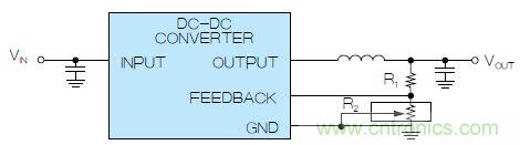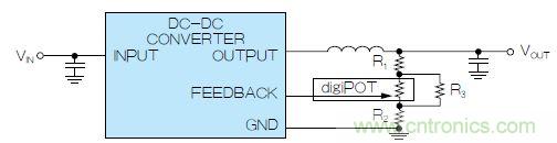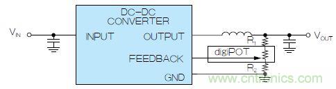 圖2. 使用數(shù)字電位計(jì)調(diào)整DC-DC轉(zhuǎn)換器輸出電壓,組成可變反饋電阻