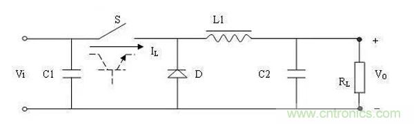 開關(guān)電源就是采用功率半導(dǎo)體器件作為開關(guān)元件,通過周期性通斷開關(guān),控制開關(guān)元件的占空比來調(diào)整輸出電壓。開關(guān)元件以一定的時間間隔重復(fù)地接通和斷開,在開關(guān)無件接通時輸入電源Vi通過開關(guān)S和濾波電路向負(fù)載RL提供能量,當(dāng)開關(guān)S斷開時,電路中的儲能裝置(L1、C2、二極管D組成的電路)向負(fù)載RL釋放在開關(guān)接通時所儲存的能量,使負(fù)載得到連續(xù)而穩(wěn)定的能量。