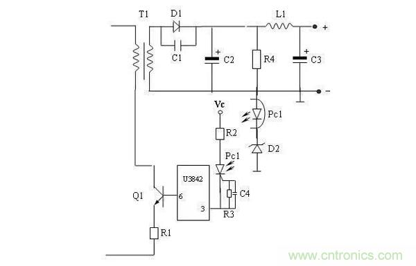 經(jīng)檢查此開關(guān)電源采用U3842 PWM控制芯片,經(jīng)查找相關(guān)的資料得知,當(dāng)U3842芯片的3端電壓高于1伏時,內(nèi)部電流敏感比較器輸出高電平,將PWM鎖存器復(fù)位使輸出關(guān)閉。通電測量U3842的3端高于1伏,6端無輸出,經(jīng)檢查相關(guān)電路,發(fā)現(xiàn)穩(wěn)壓管D2擊穿,如圖3,故PC1導(dǎo)通,致使U3842的3端為高電平,故6端無輸出,開關(guān)管不工作,直流側(cè)無直流輸出。更換同型號穩(wěn)壓管D2,故障解除。