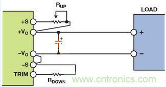 輸出電壓可通過改變連接電源模塊正輸出端或接地端的電阻來進行調節(jié)通過連接外部電阻RUP并使RDOWN浮空,可以向上調整輸出電壓(高于標稱輸出電壓),或者通過連接外部電阻RDOWN并使RUP短路(電阻值為零)向下調整(低于標稱輸出電壓)。