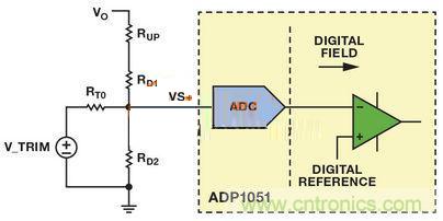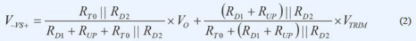 VS+引腳上的正常工作電壓為1V。若 VTRIM為1V左右且RT0遠大于RD2,則可忽略電路的其余分支部分。復合網(wǎng)絡用作簡單分壓器,并調節(jié)RUP電阻值,提供類似于模擬控制器的特性,實現(xiàn)了模擬電源模塊中的電壓向上調整。