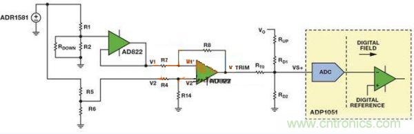 圖5中的電路具有兼容模擬向上或者向下調壓的功能兩個電阻分壓器產生兩個基準電壓,其中一個基準電壓表示模擬控制器所需的輸出基準電壓,另一個表示內部基準電壓。利用一個電壓跟隨器來避免所需的輸出基準電壓與后續(xù)電路相互影響。利用AD822 FET輸入運算放大器,將所需的輸出基準電壓(V1)從模擬控制器的內部基準電壓(V2)中去除,得到所需的電壓差。此電路的線性放大增益確保了VTRIM足夠大,從而能對VVS+產生影響。