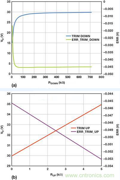 圖6:使用重新配置的反饋網(wǎng)絡后,調整ADP1051輸出電壓的計算結果:(a)向下調整 (b)向上調整