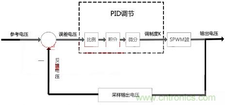 由于輸入電壓隨著負載變大會有降低,切系統(tǒng)濾波電感具有電阻成分,這些因素導致在系統(tǒng)開環(huán)下負載調整率較大,因此本系統(tǒng)采用閉環(huán)反饋調整輸出電壓穩(wěn)定在10V。我們選用經(jīng)典PID反饋調整,對輸出電壓進行采樣,與參考電壓比較得到誤差電壓后進行位移式PID調節(jié),PID運算輸出作為SPWM的調制度K,與正弦波表相乘后形成新的波表進行生成SPWM波運算。用此方法后負載調整率降到了1%以下,圖5是反饋過程框圖。