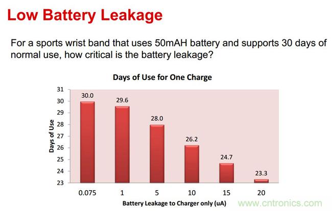 演講中,文博士還提到,可穿戴設(shè)備對(duì)于電池模塊的尺寸要求很小,對(duì)于電池精度的要求卻是日益提高,如何實(shí)現(xiàn)較小的充電終止電流,也是目前急需攻克的難題之一。“基于較小尺寸和充電終止電流的需求,TI推出了為可穿戴設(shè)備等低功耗應(yīng)用量身定制的鋰離子電池充電器:Bq25100。”文博士為我們介紹道,Bq25100采用了0.9×1.6毫米的WCSP封裝,可支持尺寸僅為前代一半的充電器解決方案;Bq25100可以對(duì)低至10mA或高達(dá)250mA的快速充電電流進(jìn)行準(zhǔn)確控制,同時(shí)還可實(shí)現(xiàn)低至1mA的充電終止,從而支持微型鋰離子紐扣電池。此外,Bq25100還支持不足75nA的漏電流,可解決因漏電流帶來的電池?fù)p耗問題,延長(zhǎng)電池使用時(shí)間。