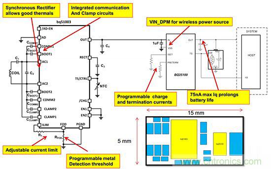 所幸的是,無線充電并沒有那么大的技術(shù)障礙,市面上已經(jīng)有了很多可行的方案出現(xiàn),當(dāng)前TI也順勢(shì)推出了適用于可穿戴設(shè)備的無線充電解決方案,在該方案的接收模塊上,我們可以看到除了應(yīng)用了上述所提及的降壓轉(zhuǎn)換器Bq25100外,還加入了基于Qi標(biāo)準(zhǔn)的無線充電接收器——BQ51003($1.4625)。