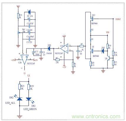 當(dāng)有感應(yīng)負(fù)載時(shí),R20(0.33歐)電阻上的電壓會(huì)增大,經(jīng)運(yùn)放U2A放大A=1+R5/R6=23倍后,電壓變化明顯,再經(jīng)過(guò)1N4148整流濾波,得電壓U1與基準(zhǔn)源Uo比較,此時(shí)U1>Uo,運(yùn)放輸出Ui為高電平,七彩燈閃爍;當(dāng)感應(yīng)負(fù)載充滿(mǎn)電(或沒(méi)有感應(yīng)到負(fù)載),此時(shí)U1<Uo,運(yùn)放輸出Ui為低電平,綠燈亮。