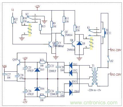 (1)當(dāng)開(kāi)關(guān)S2斷開(kāi)時(shí),整充電器處于智能充電過(guò)程。充電器啟動(dòng)時(shí),繼電器K1閉合,同時(shí)K2為斷開(kāi)狀態(tài)。當(dāng)有感應(yīng)負(fù)載時(shí),七彩燈閃爍,Ui為高電平,此時(shí)Q5飽和,電壓Uceq為0.67V,低于Q2+Q4的導(dǎo)通電壓之和(1.34V),Q2與Q4構(gòu)成達(dá)林頓,同時(shí)截止,繼器K1吸合;當(dāng)感應(yīng)負(fù)載充滿(mǎn)電(或無(wú)感應(yīng)負(fù)載)時(shí),綠燈亮,即Ui為低電平,此時(shí)Q3截止,電容C5與R9構(gòu)成RC充電電路,當(dāng)電容充電電壓到達(dá)Q2與Q4的導(dǎo)通電壓時(shí),Q2導(dǎo)通,使Q4飽和,此時(shí)繼電器工作電壓只有0.67V,繼電器斷開(kāi),整個(gè)電路處于完全斷電狀態(tài)。