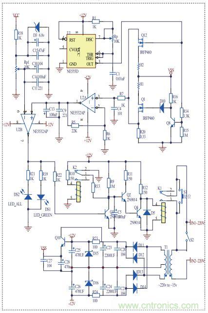 斷電后,繼電器K2閉合,此時(shí)C5與R13構(gòu)成RC放電電路,給C5快速放電。當(dāng)按一下輕觸復(fù)位開(kāi)關(guān)時(shí),充電器重新啟動(dòng)。當(dāng)感應(yīng)負(fù)載充滿(mǎn)電(或無(wú)感應(yīng)負(fù)載)時(shí),電容C5充電,其電壓為Ut 由公式Ut=12*(1-e-t/R9C5)得:t=-R9C5ln(1-Ut/12) 其中C5=100UF,R9=1MΩ,Ut=1.34V, 經(jīng)計(jì)算得斷電時(shí)間:t=10S 實(shí)現(xiàn)了10秒自動(dòng)斷電。在綠燈亮的10秒內(nèi)只要有感應(yīng)負(fù)載,則Ui為高電平,Q3飽和,電容C5放電。整個(gè)充電過(guò)程實(shí)現(xiàn)智能化斷電。