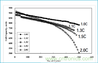 這是關于鋰離子電池充放電速率與其容量和循環(huán)壽命的關系圖,縱軸代表容量,橫軸代表循環(huán)壽命,由不同的點所描繪出來的曲線代表了用不同的速率對電池進行充放電時容量與循環(huán)壽命之間的關系。其中的C是與電池的容量有關的充放電速率數(shù)據(jù),假設某個電池的容量為1000mAH,如果用1000mA的電流對它進行充電或放電,則充滿或放完其全部電能的時間是一個小時,這時候的C就代表1000mA,2C則代表2000mA。根據(jù)這些定義,這個圖告訴我們?nèi)缦滦畔ⅲ哼@個電池的初始容量為900mAH,假如用1C即900mA的電流對它進行充放電,經(jīng)過500個循環(huán)后,其容量還剩下大約780mAH;如果用2C即1800mA的電流對它進行充放電,則經(jīng)過500個循環(huán)后,其容量會下降到大約500mAH。