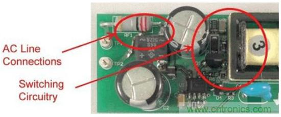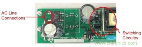 圖1是這些非計(jì)劃中電容的一個(gè)實(shí)例。圖中的右側(cè)是一個(gè)垂直安裝的FET,所帶的開關(guān)節(jié)點(diǎn)與鉗位電路延伸至了圖片的頂部。輸入連接從左側(cè)進(jìn)入,到達(dá)距漏極連接1cm以內(nèi)的位置。這就是故障點(diǎn),在這里FET的開關(guān)電壓波形可以繞過EMI濾波器耦合至輸入。