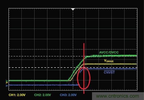 在所有電源均完全建立之前,不得切換數(shù)字引腳。對于SAR ADC,轉(zhuǎn)換開始引腳CNVST 可能對噪聲敏感。在圖1 所示示例中,當(dāng)AVCC、DVCC 和VDRIVE 仍在上升時,主機(jī)cPLD 拉高CNVST。這可能使 AD7367 進(jìn)入未知狀態(tài),因此,在電源完全建立之前,主機(jī)應(yīng)使 CNVST 保持低電平。