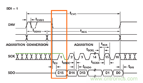 ADI 公司帶SPI 接口的許多SAR ADC 都是從 CS 或CNV 的下降沿為MSB 提供時鐘信號,剩余的數(shù)據(jù)位則跟隨SCLK 的下降沿,如圖3 所示。在讀取MSB 數(shù)據(jù)時,要使用等式中的tEN 而非tDRV。